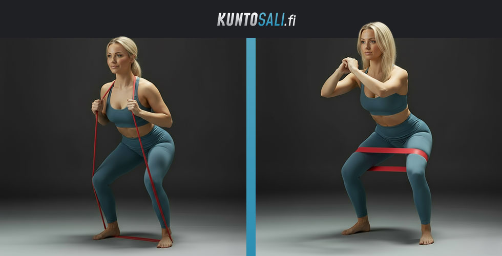 Riippuen kuminauhan pituudesta, voi vastuskuminauhalla saada lisää tehoa kyykkäämiseen eri lihaksille.