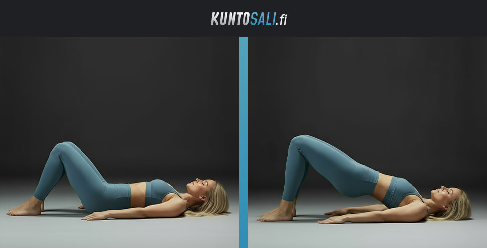- Nouse niin ylös, että vartalosi muodostaa suoran linjan olkapäistä polviin. Älä yliojenna alaselkää kaarelle. Liikkeen tulee tuntua pakaroissa, ei alaselässä.