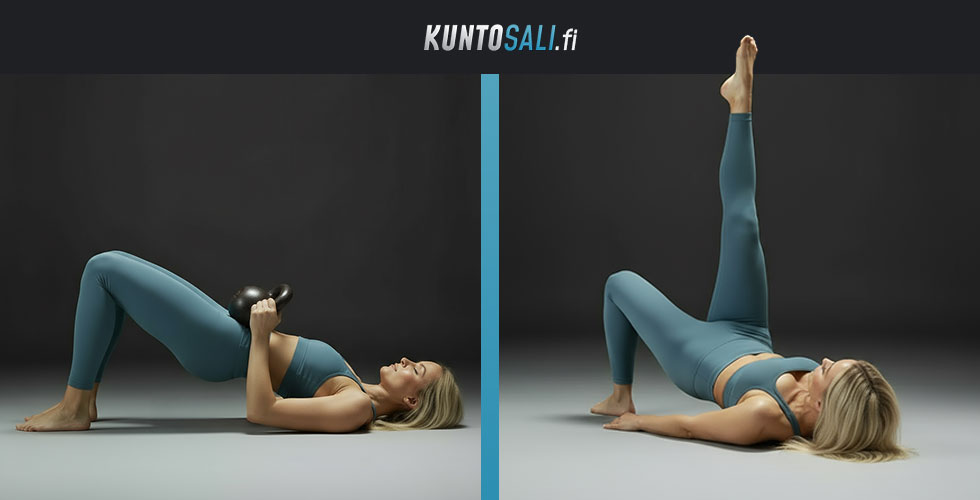 - Työnnä tukijalan kantapäällä lantio ylös. Tämä kaksinkertaistaa työskentelevän pakaran kuorman ja haastaa lantion hallintaa.