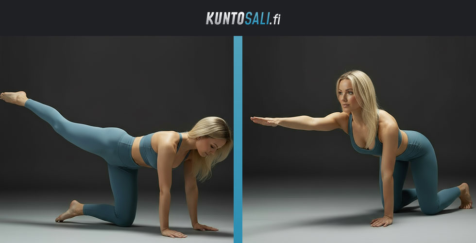 - Toista liike toiselle puolelle (vasen käsi ja oikea jalka).
