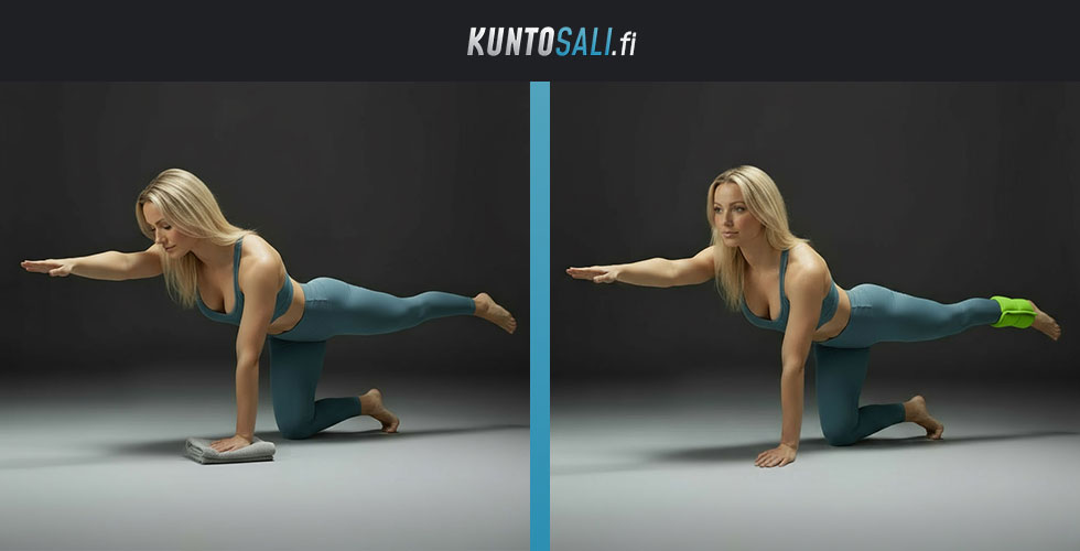- Jos sinulla on liukas lattia (ja sukat), voit “liu’uttaa” käden ja jalan suoraksi lattiaa pitkin. Tämä poistaa tasapainohaasteen ja antaa sinun keskittyä pelkkään keskivartalon pitoon.