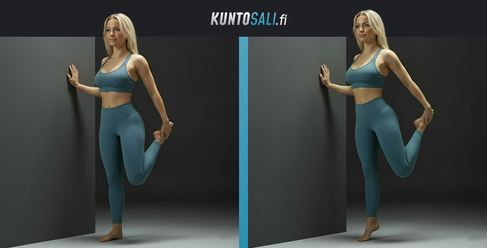 - Seiso yhdellä jalalla (pidä toinen jalka koukussa ilmassa tai nilkan takana) ja ota tukea tasapainon säilyttämiseksi.