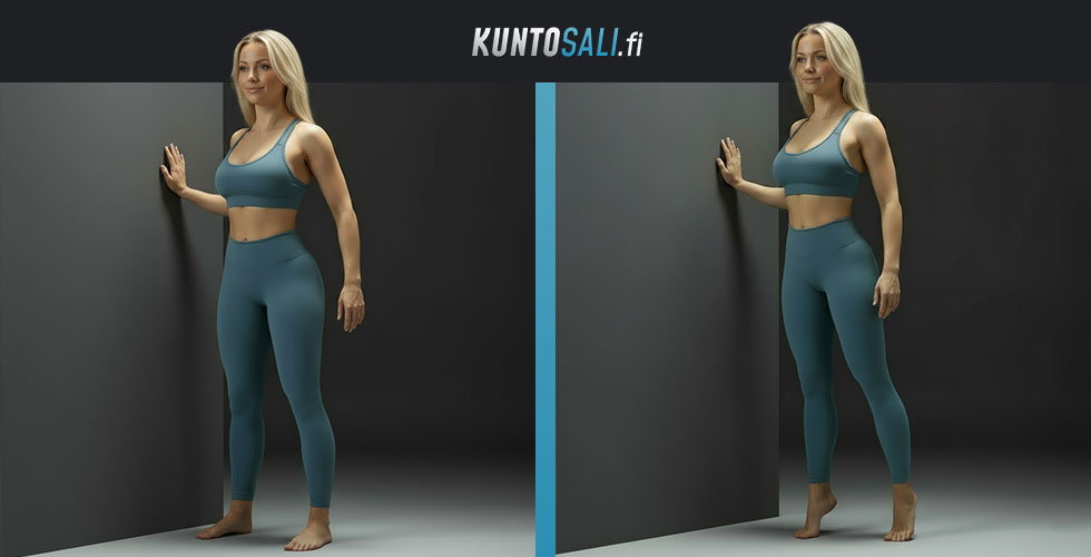 - Pysy yläasennossa 1-2 sekuntia ja purista pohkeita tietoisesti.